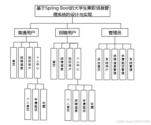 按照大学生兼职信息管理系统的角色,划分了普通用户模块、招聘用户模块和管理员模块这两大部分。