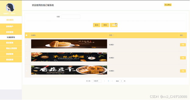 系统管理:系统管理功能包括轮播图管理等,用于维护系统的基本设置和外观。管理员可以上传和编辑轮播图,设置系统的基本参数等,确保系统的外观和功能符合用户需求。