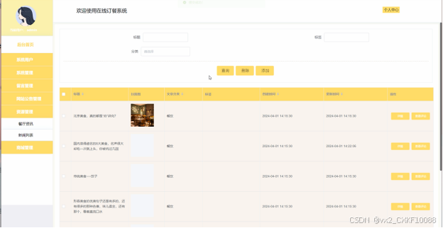 资源管理:资源管理功能包括餐厅资讯和资讯分类的管理。管理员可以添加、编辑和删除餐厅资讯和资讯分类,确保系统的资讯信息准确无误。同时,管理员还可以对资讯进行分类管理,方便用户查找和浏览。