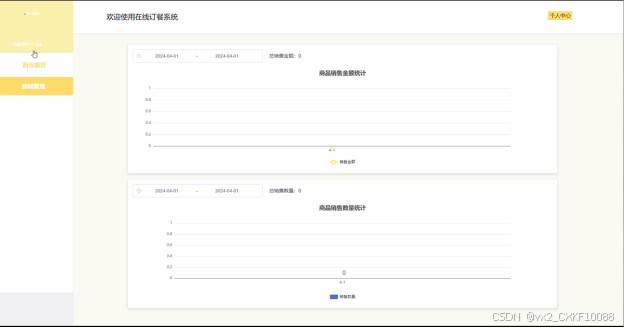 后台首页:商家登录后台后,首先看到的是后台首页。这个页面提供了商品销售额统计图和商品销售数量统计图,使商家能够直观地了解哪些菜品受欢迎,哪些菜品销售不佳,从而根据数据调整菜品策略。