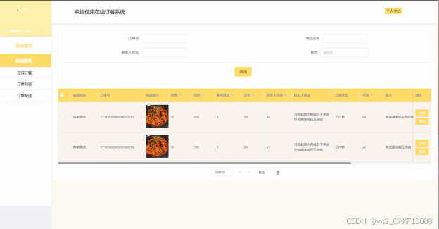 当商家用户点击“订单列表”按钮,商家可以查看所有用户的订单,包括订单状态、菜品、配送地址等,方便商家及时处理订单。界面如下图4-12所示。