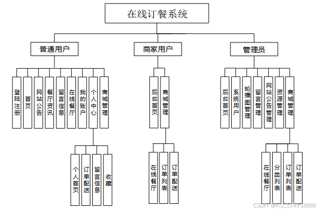 根据在线订餐系统的角色,该系统被划分为普通用户模块、商家用户模块和管理员管理模块。