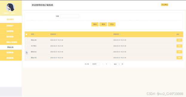 网站公告管理:网站公告管理功能允许管理员发布和管理系统的公告信息。管理员可以编辑公告内容、设置公告发布时间等,确保用户能够及时了解到系统的最新动态和重要信息。