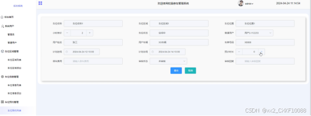 车位信息:用户点击可通过搜索车位名称、车位区域和车位状态进行查看车位信息列表,同时可进行点赞、收藏、评论和预约操作。点击“预约”按钮,可填写预约信息,包括车位名称、车位区域、车位位置、小时单价、车位状态、普通用户、用户姓名、用户车辆、车牌号码、计划进场时间和计划出场时间。界面如图所示。