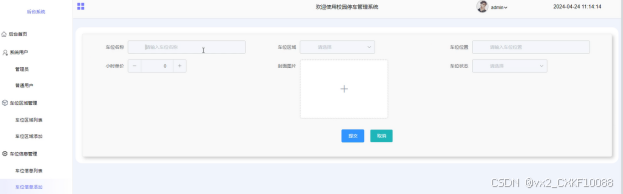 车位信息管理:管理员点击可查看车位信息列表和车位信息添加;点击“车位信息添加”,输入车位名称,选择车位区域,输入车位位置、小时单价,上传封面图片和选择车位状态,点击“提交”按钮进行添加。界面如下图所示。
