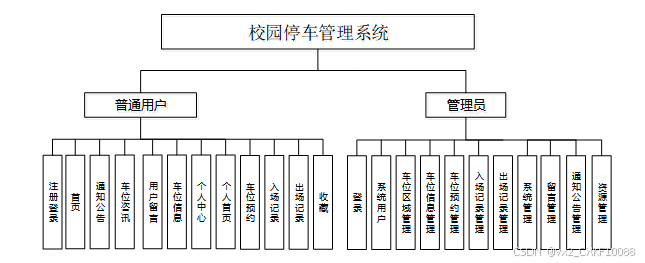 按照校园停车管理系统的角色,划分为了普通用户模块和管理员模块这两大部分。