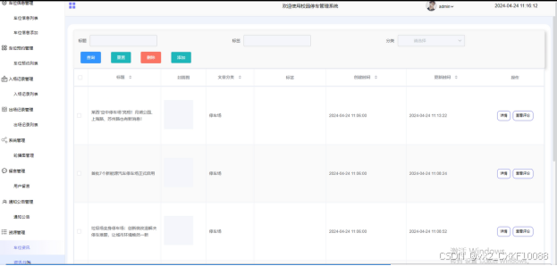 资源管理:管理员点击可查看车位咨讯和咨讯分类;如需添加新的咨讯,点击“添加”按钮,上传封面图,输入标题,选择分类,输入标签、描述和正文,点击“提交”按钮进行添加。同时可对咨讯进行增删改查。界面如下图所示。