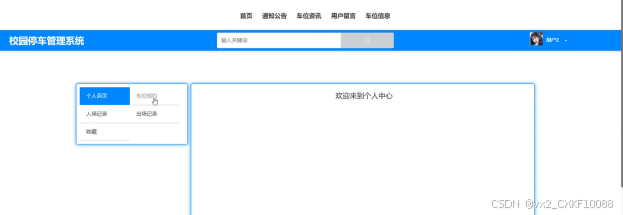 (6)个人中心:用户点击头像可查看“个人中心”,包括个人首页、车位预约、入场记录、出场记录和收藏。