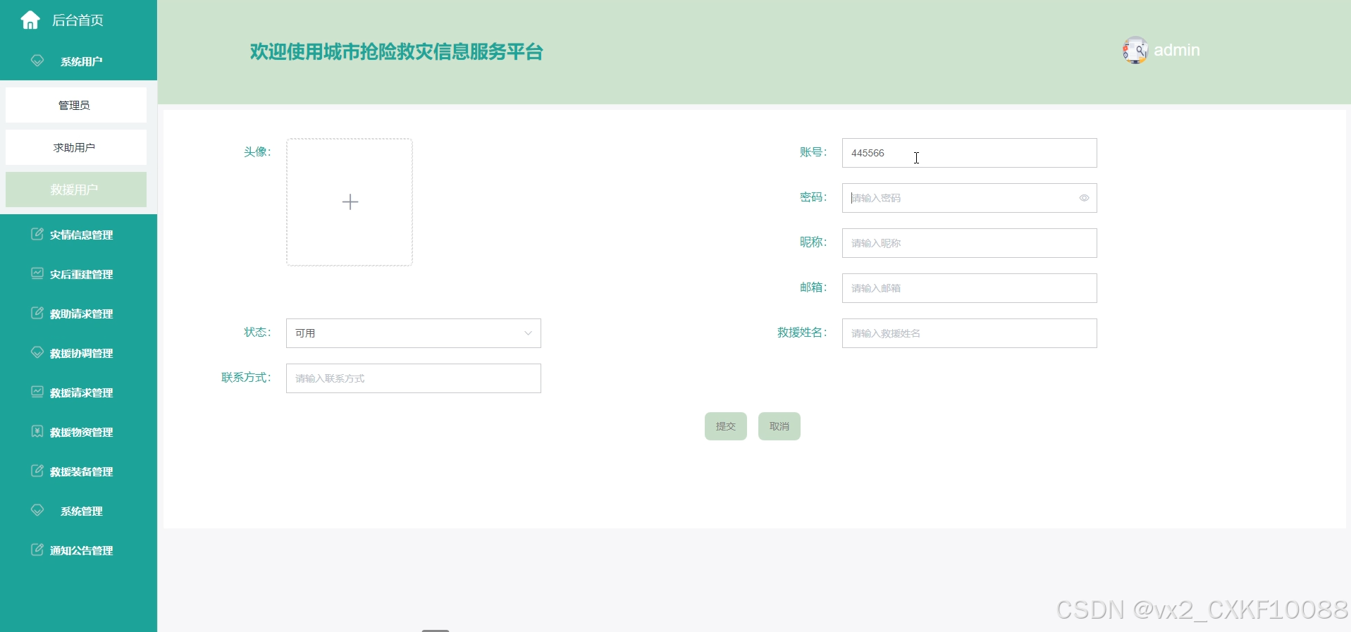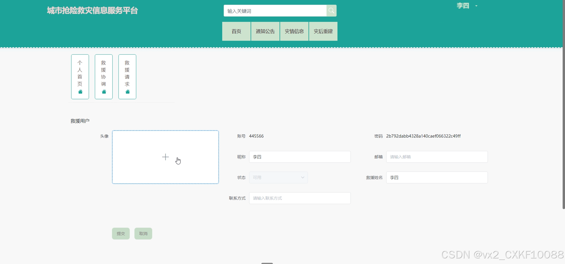 - 个人中心:用户可以修改个人信息和登录密码,也可以查看和管理灾情信息、救助请求、救援协调等功能操作。