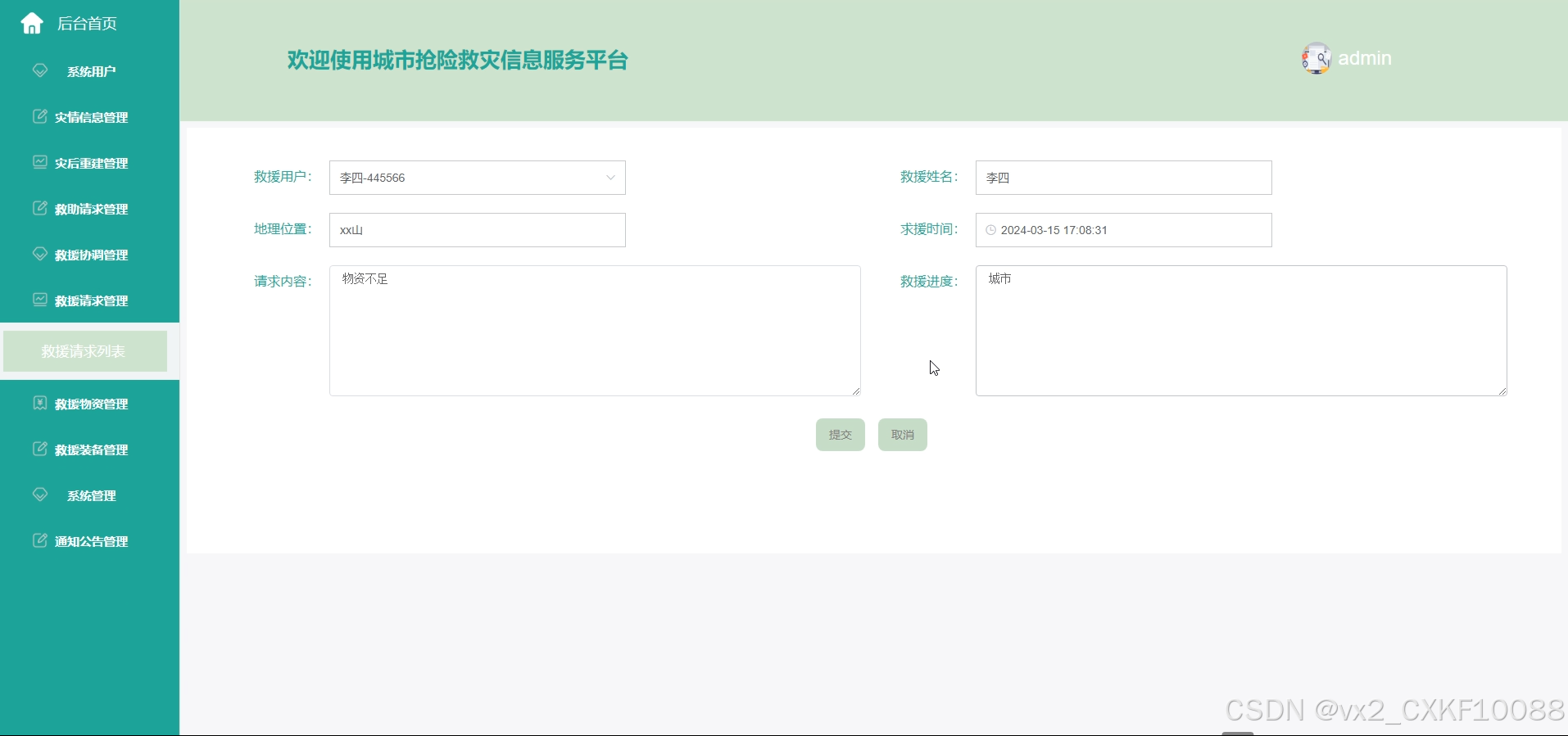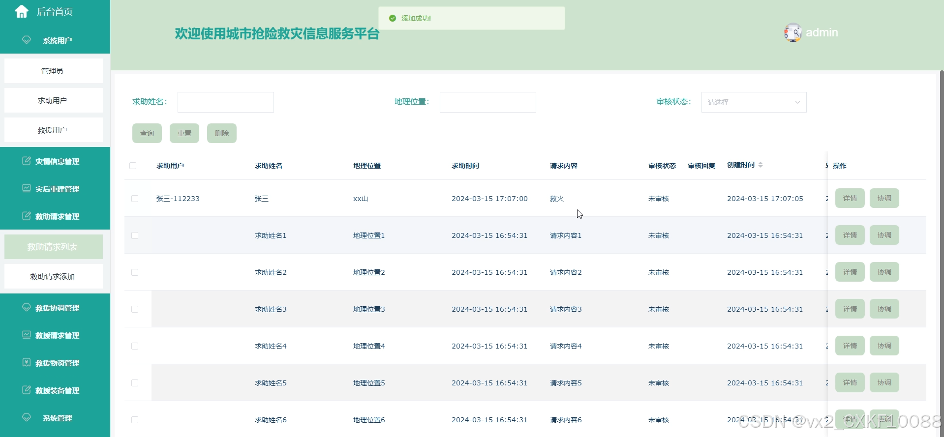 6.救援协调管理:管理员可以查看救援协调列表中的某一救援协调信息详情,可以对救援协调进行查询、重置、新增和删除操作。