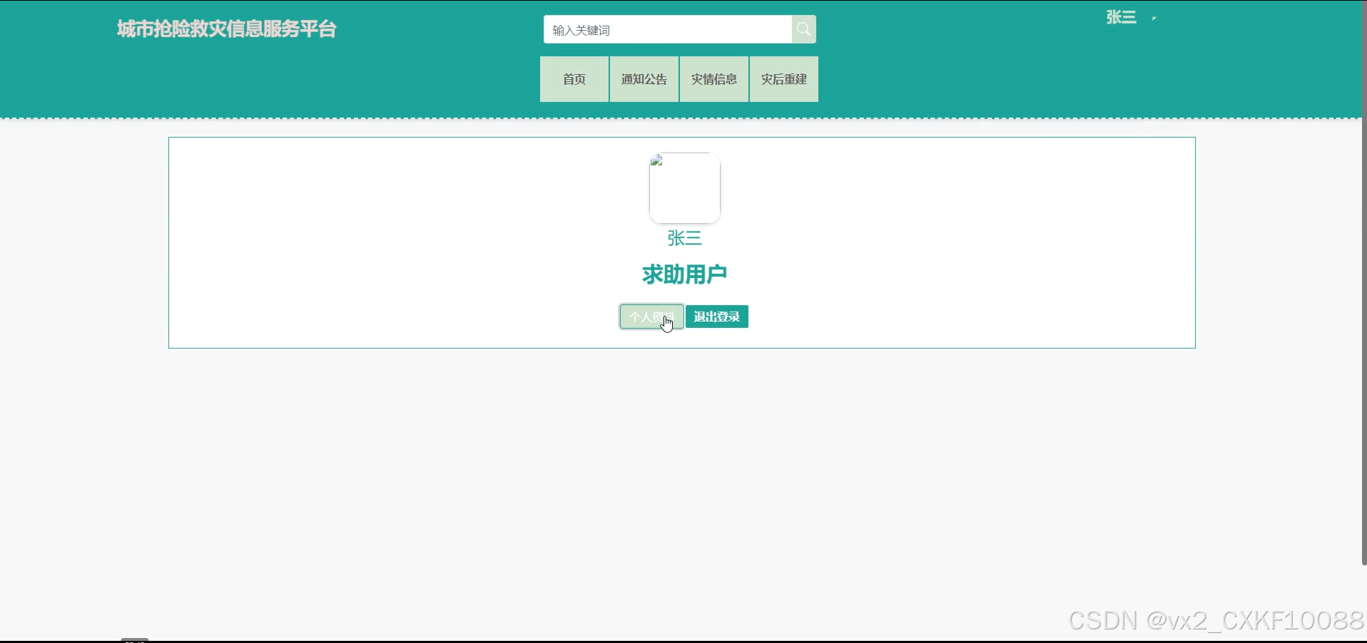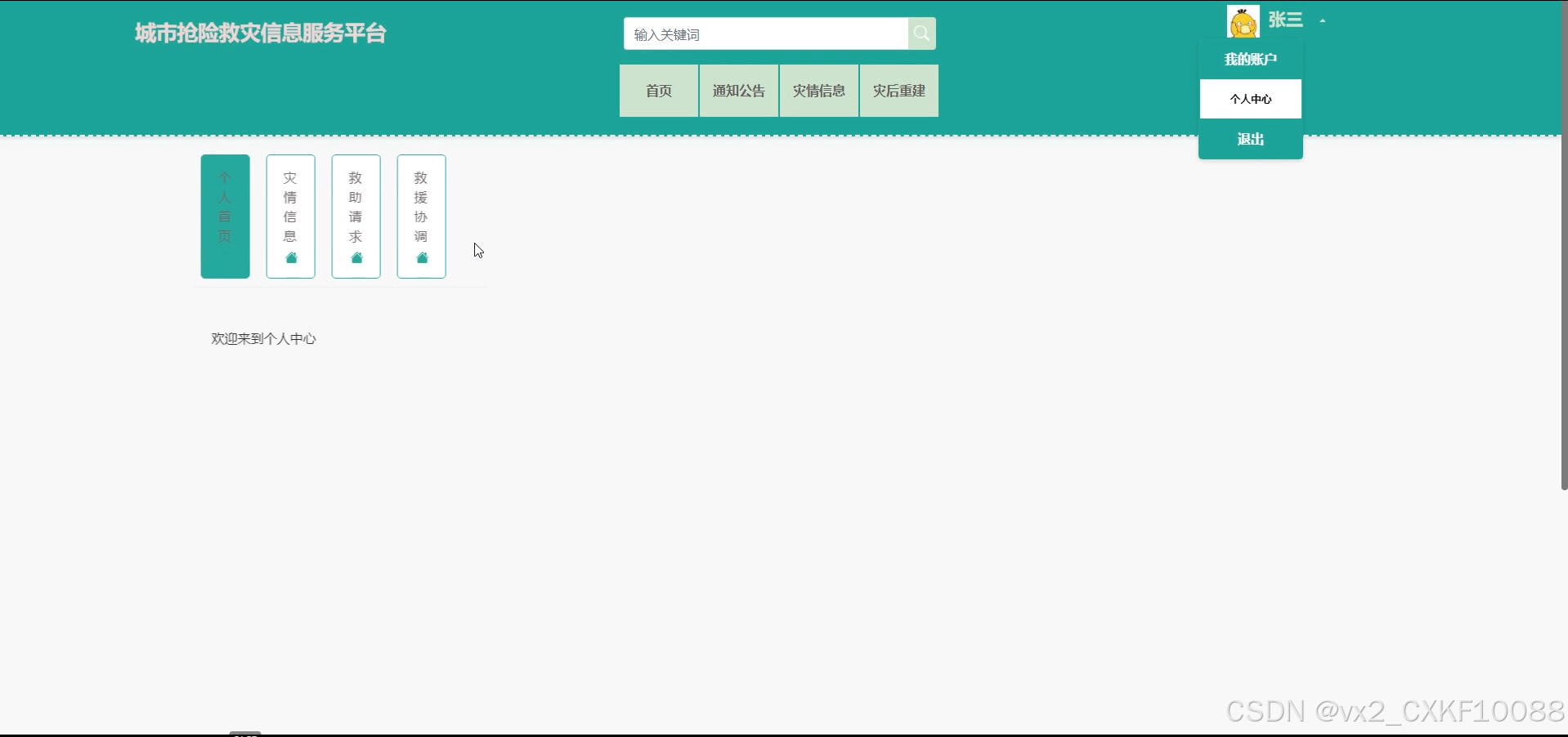 点击右上角“我的”下拉按钮“个人中心”,进入个人中心页面可以查看个人首页、灾情信息、救助请求、救援协调。其界面如下图4-8所示。