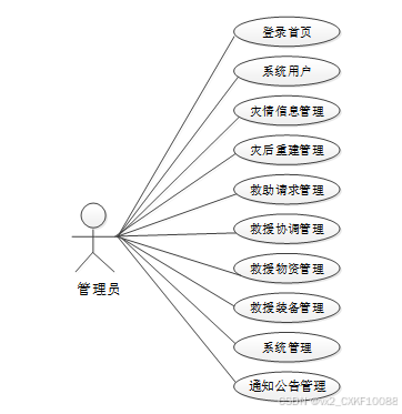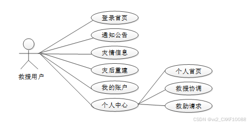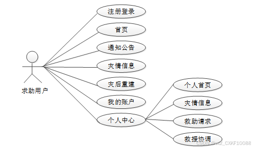 通过2.2功能的分析,本系统用户主要分为求助用户、救援用户和管理员用户,系统用户角色用例图分别如下图2-1,2-2所示: