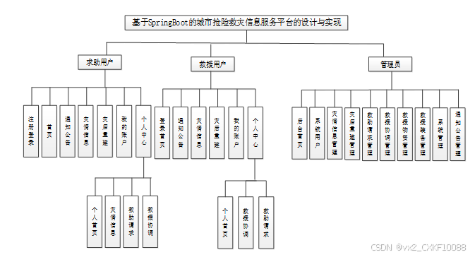 按照城市抢险救灾信息服务平台的角色,主要划分为救援用户、求助用户和管理员三大功能模块,具体内容如下。