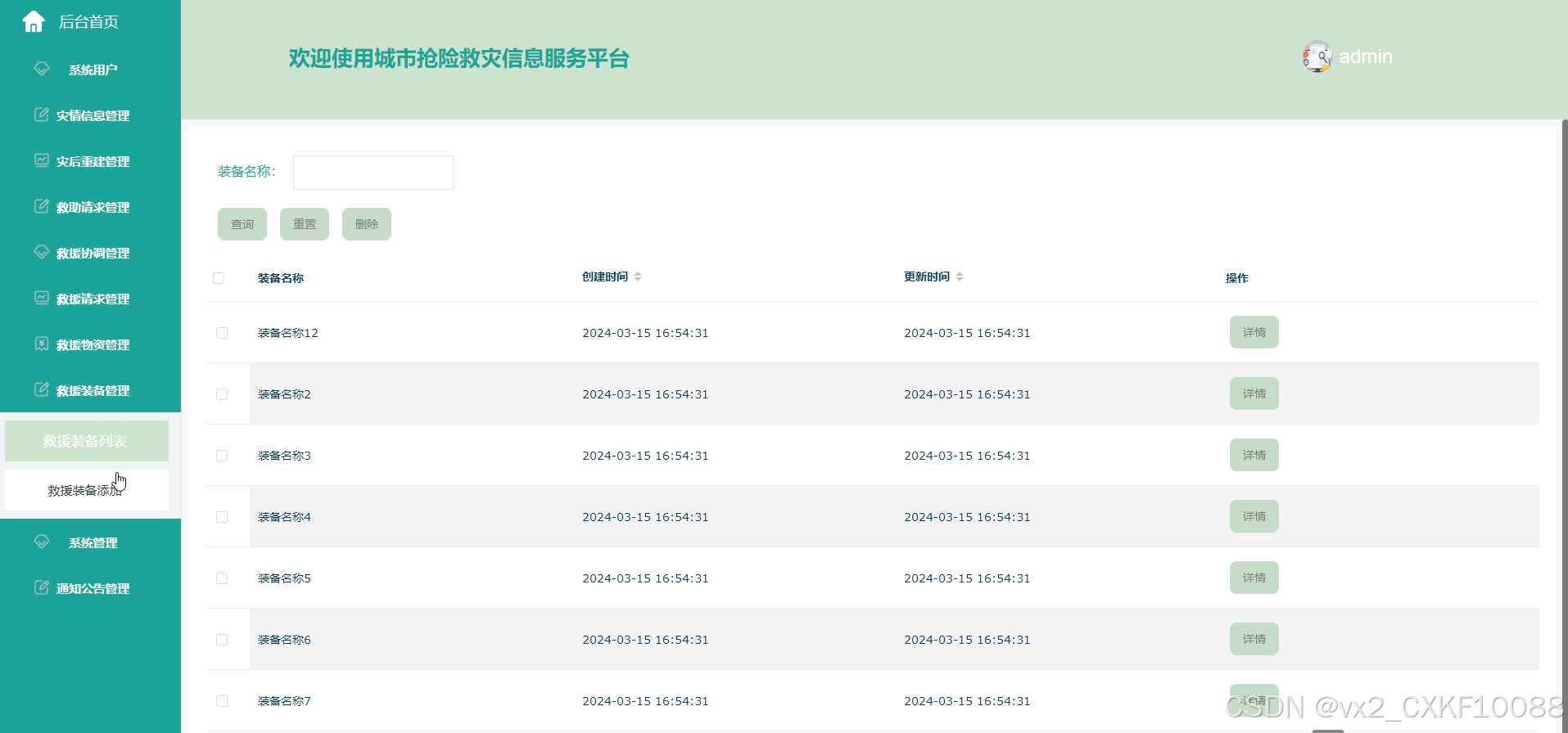 8.救援装备管理:管理员可以查看救援装备。列表中的某一救援装备详情并回复,可以对救援装备进行查询、重置、新增和删除操作。