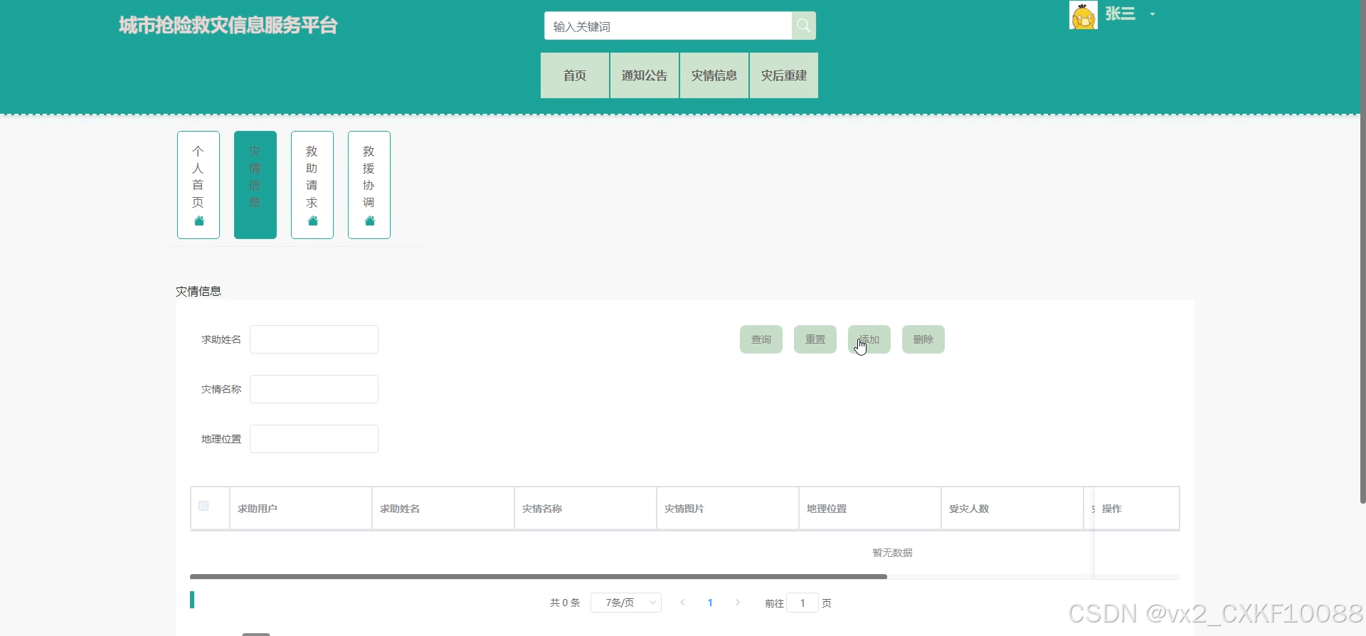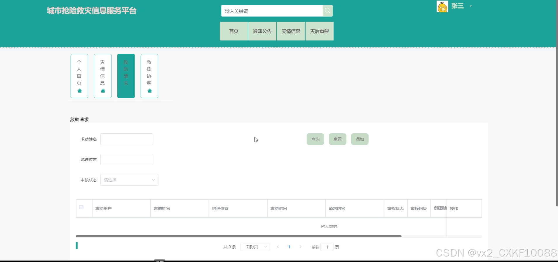 用户可以查看个人中心的个人首页、救援协调、救助请求并对其进行查询、重置和删除操作。其界面如下图4-17所示: