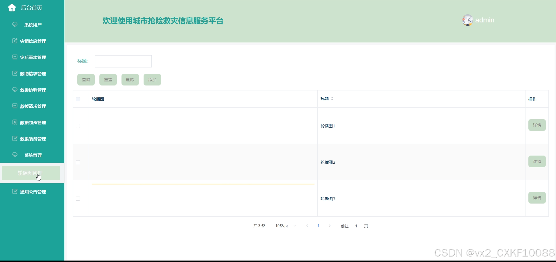 管理员可以查看系统管理列表中的某一轮播图进行发布,可以对系统管理进行查询、重置、新增和删除操作。其界面如下图4-14所示: