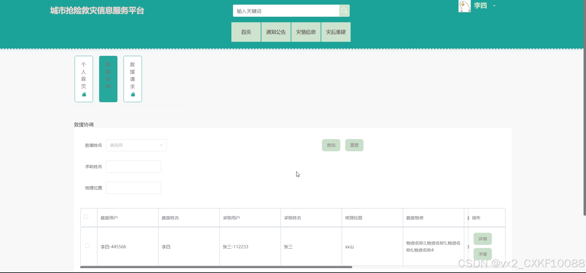 管理员可以查看救援协调列表中的某一救援协调的详情,可以对救援协调进行查询、重置、新增和删除操作。其界面如下图4-12所示: