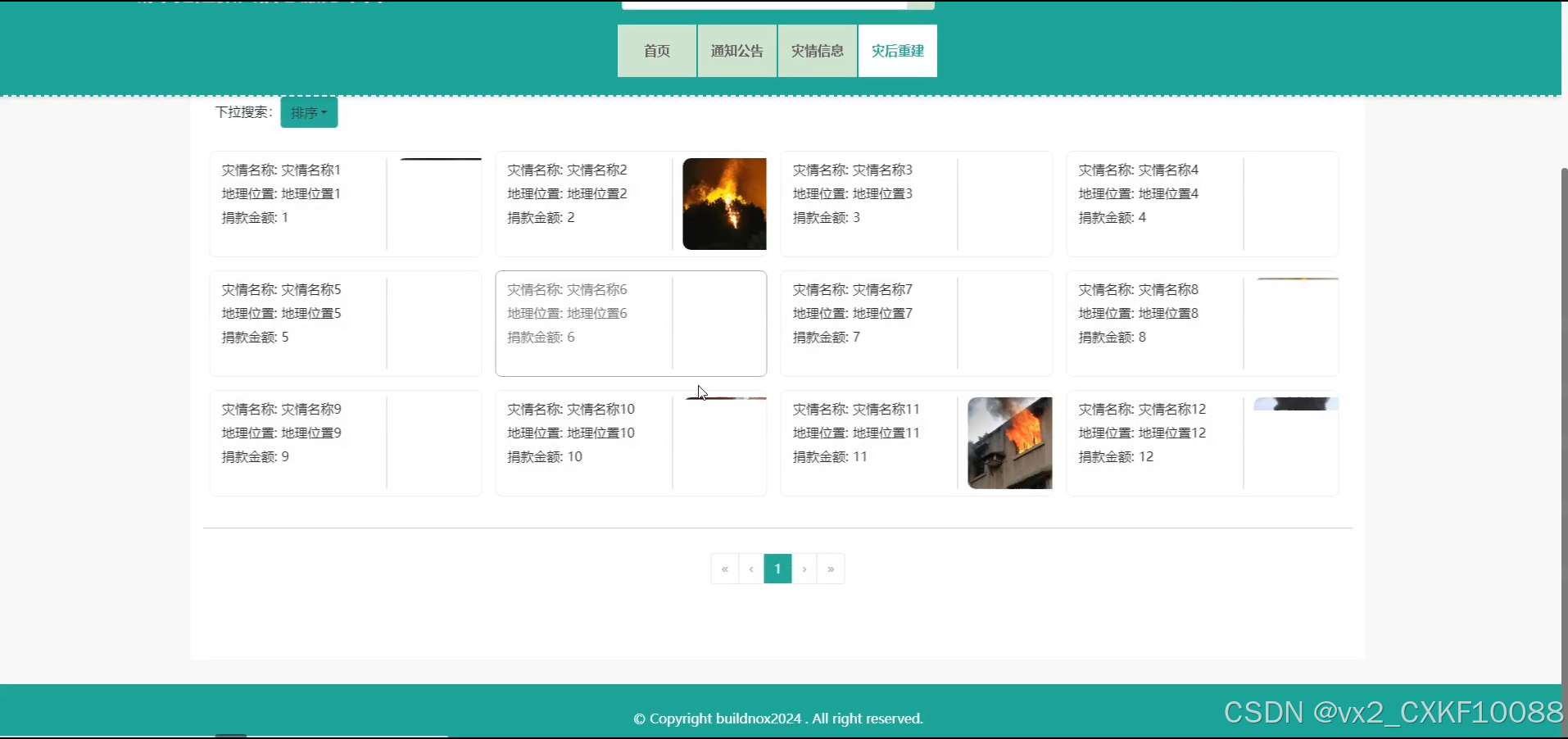 4.灾后重建管理:管理员可以查看灾后重建列表中的某一报名灾后重建和评论,可以对灾后重建进行查询、重置、新增和删除操作。