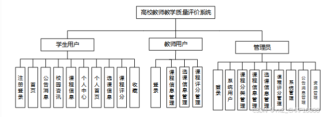 高校教师教学质量评价系统提供了丰富的功能,本系统主要分为学生用户、教师用户、督导用户和管理员,具体功能分析如下: