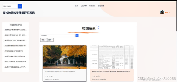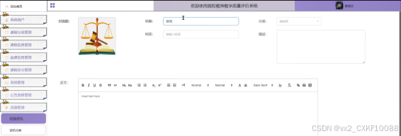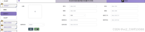 教师可以根据评价结果进行自我反思和调整,从而不断提高教学水平。系统采用SSM框架作为开发基础,通过前后端交互和数据库存储来实现评价数据的收集和分析。经过测试和实际应用,系统表现出良好的稳定性和用户友好性,为教师教学质量评价提供了可行且有效的解决方案。