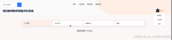 个人中心:用户点击头像可查看“个人中心”,包括个人首页、选课信息、课程评分和收藏。点击“选课信息”可对教师课程进行评分操作。界面图如下。