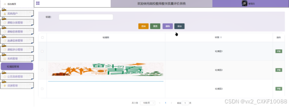 系统管理:当管理员点击“系统管理”时,可查看轮播图; 如需添加新的轮播图,点击右侧“添加”按钮,上传图片,输入标题,点击“确认”按钮进行添加;同时可对轮播图进行增删改查。界面如下图所示。