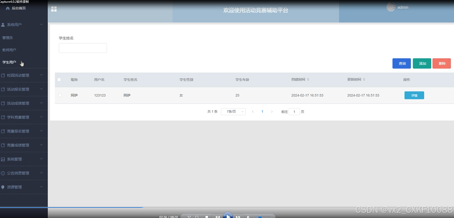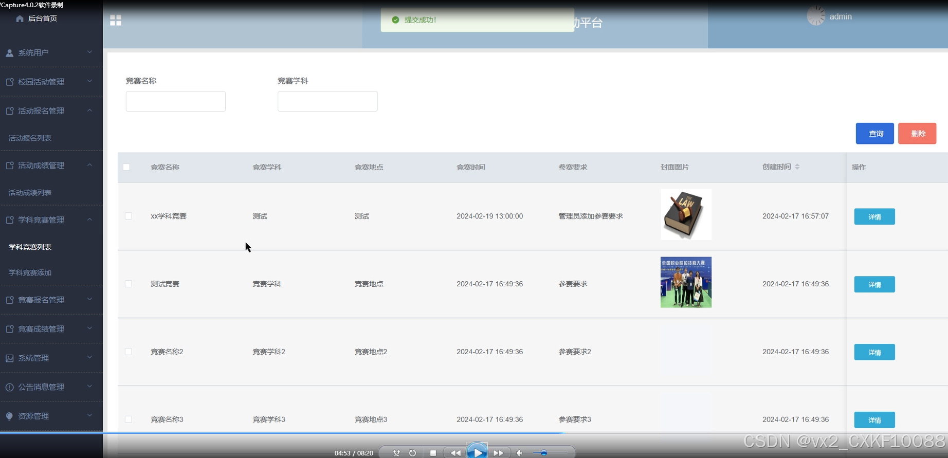 学科竞赛管理:管理员当点击“学科竞赛管理”这一菜单的时候,会出现学科竞赛列表和学科竞赛添加这两个子菜单,可以对这两个模块进行增删改查操作。学科竞赛列表和学科竞赛添加如下图所示。