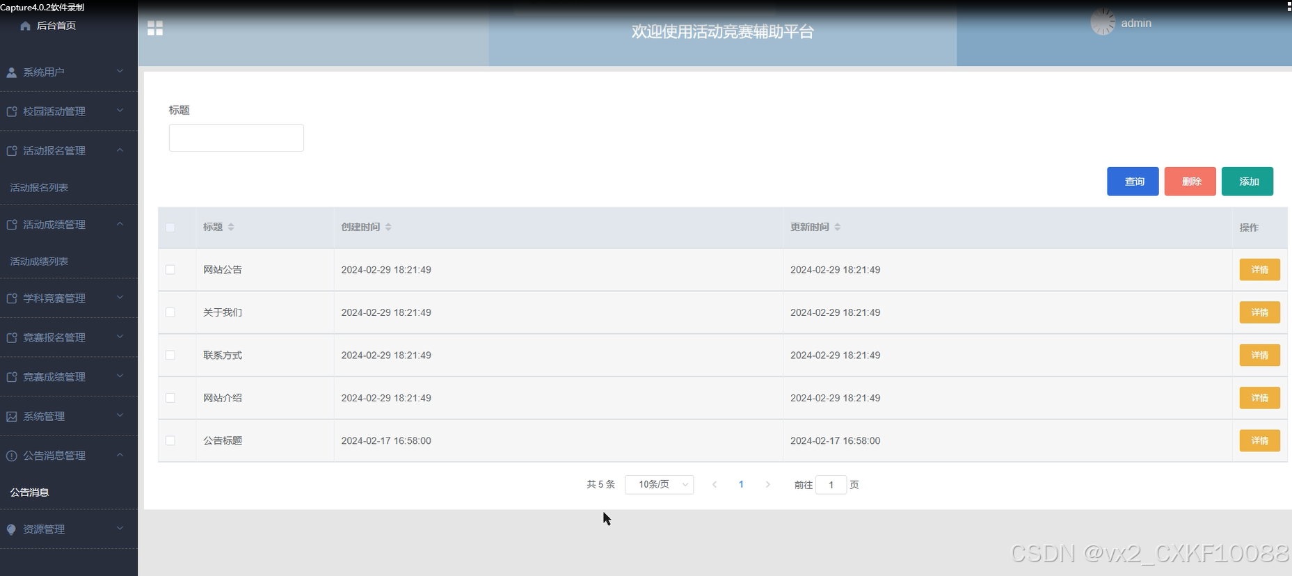 通知公告管理:管理员可以对系统前台展示的通知公告进行增删改查,方便用户进行查看。通知公告管理界面如下图所示。