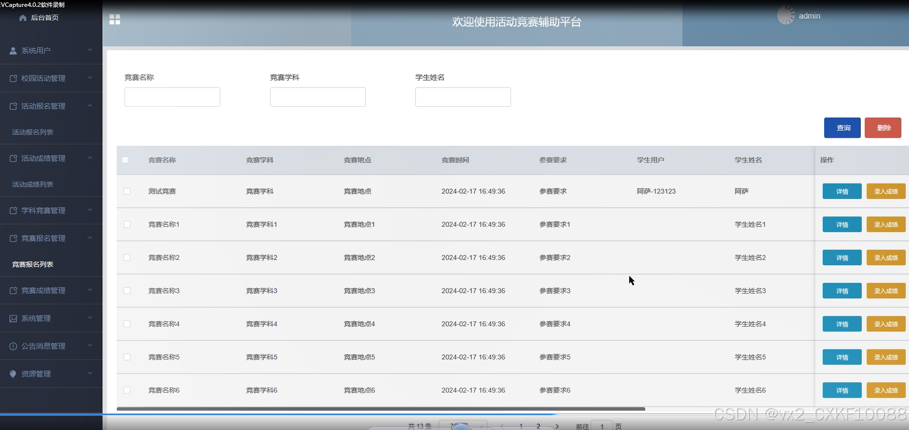 - 学科竞赛管理:负责学科竞赛的组织和管理工作。教师可以设置竞赛的规则、题目、评分标准等,并对学生的竞赛报名进行审核和管理。
