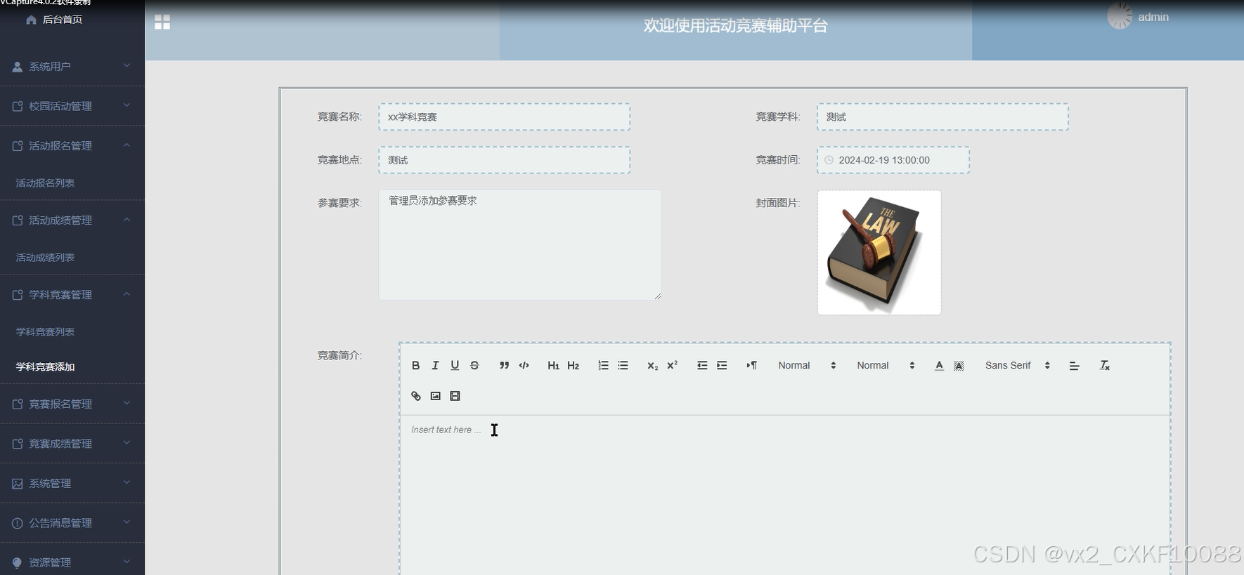 - 学科竟赛管理:组织和管理学科竞赛,包括竞赛的设置、规则制定、题目发布等。