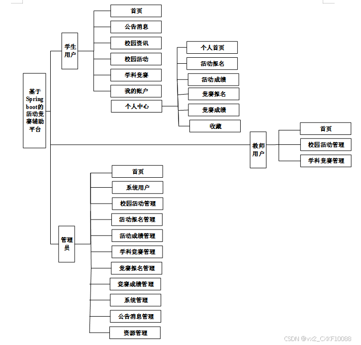 活动竞赛辅助平台分为两大部分:管理员模块、学生用户、教师用户模块。