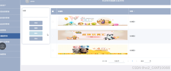 (3)系统管理:当管理员点击“系统管理”这一菜单时,可查看轮播图管理,如需添加新的轮播图,点击右侧“添加”按钮,插入轮播图图片、输入标题,点击“提交”按钮进行添加。管理员可对轮播图进行增删改查操作。