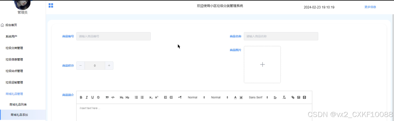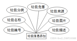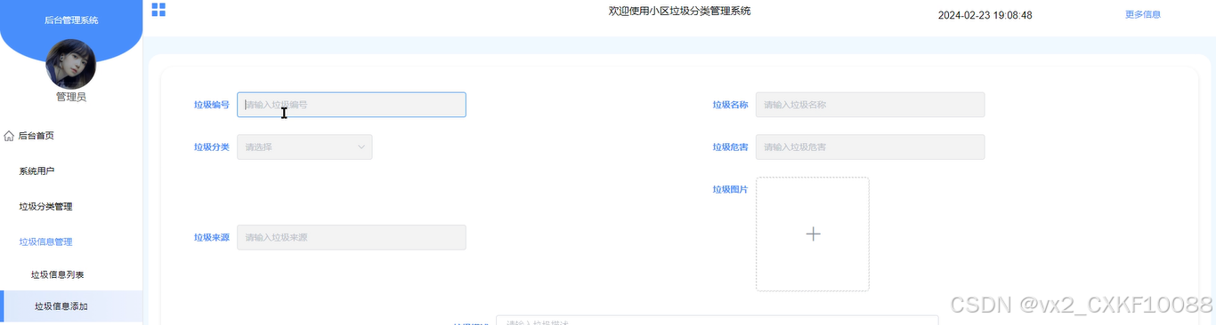 (5)垃圾信息管理:管理员点击可查看垃圾信息列表和垃圾信息添加;点击“垃圾信息添加”,输入垃圾编号、垃圾名称,选择垃圾分类,输入垃圾危害、垃圾来源,上传垃圾图片,输入垃圾描述,点击“提交”按钮进行添加。