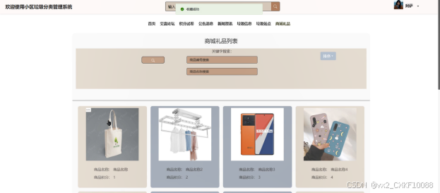 (8)商城礼品:用户点击可通过搜索商品编号和商品名称进行查看商城礼品信息,同时可对礼品信息进行收藏和兑换操作。