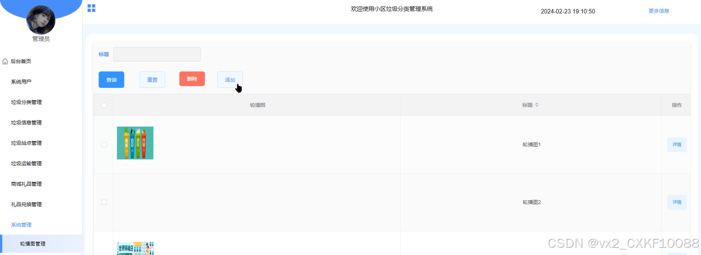 (10)系统管理:当管理员点击“系统管理”时,可查看轮播图; 如需添加新的轮播图,点击右侧“添加”按钮,上传图片,输入标题,点击“确认”按钮进行添加;同时可对轮播图进行增删改查。