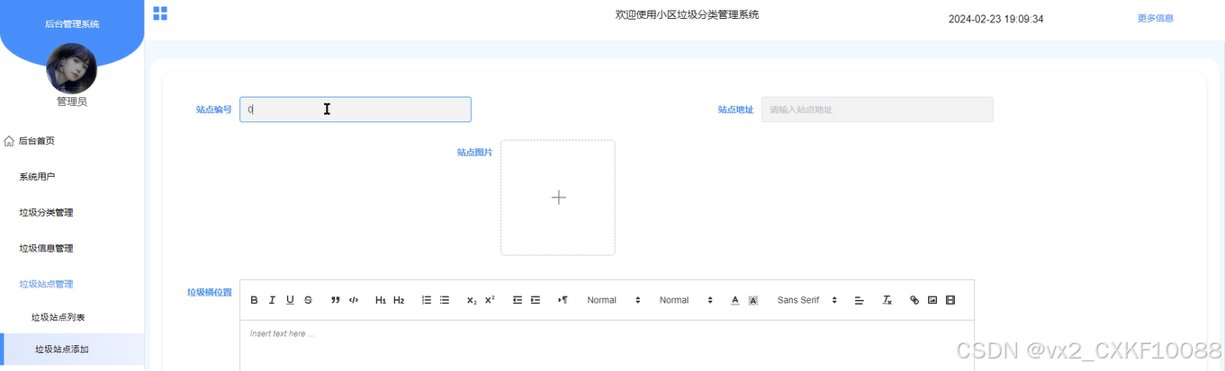 垃圾站点管理:管理员点击可查看垃圾站点列表和垃圾站点添加;点击“垃圾站点添加”,输入站点编号、站点地址,上传站点图片,输入垃圾桶位置,点击“提交”按钮进行添加。界面如下图所示。