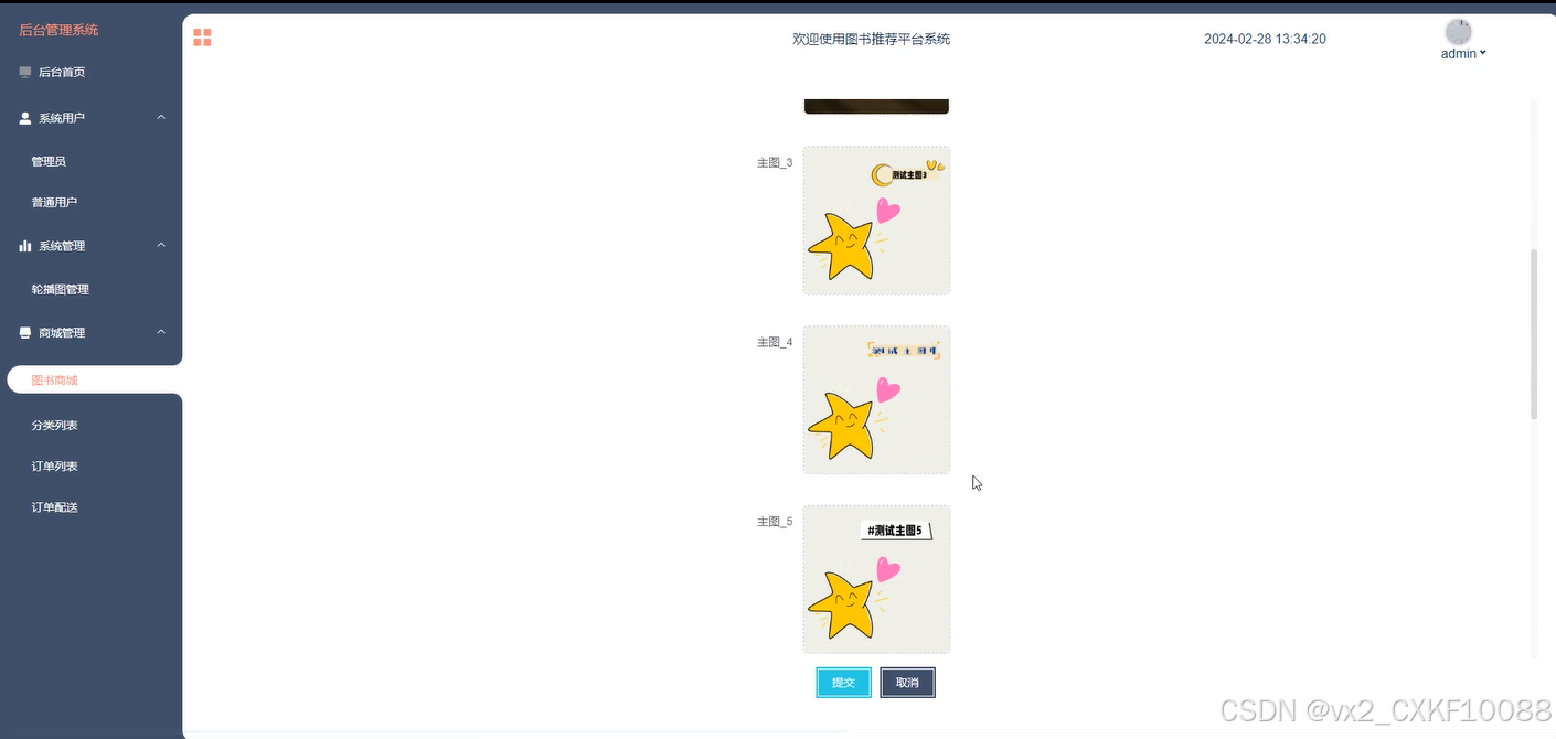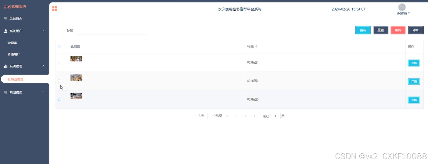 (1)系统管理:管理员点击“轮播图”菜单可以对首页展示的轮播图进行增删改查。