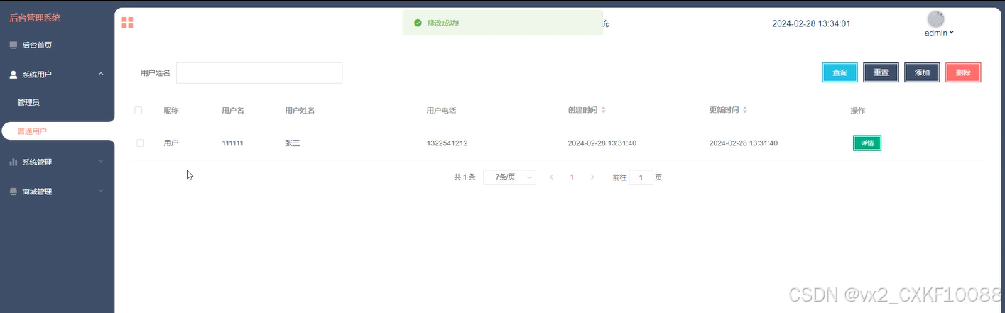 后台管理者能够实现对前台注册的用户增删改查操作,用户模块结构图如下图: