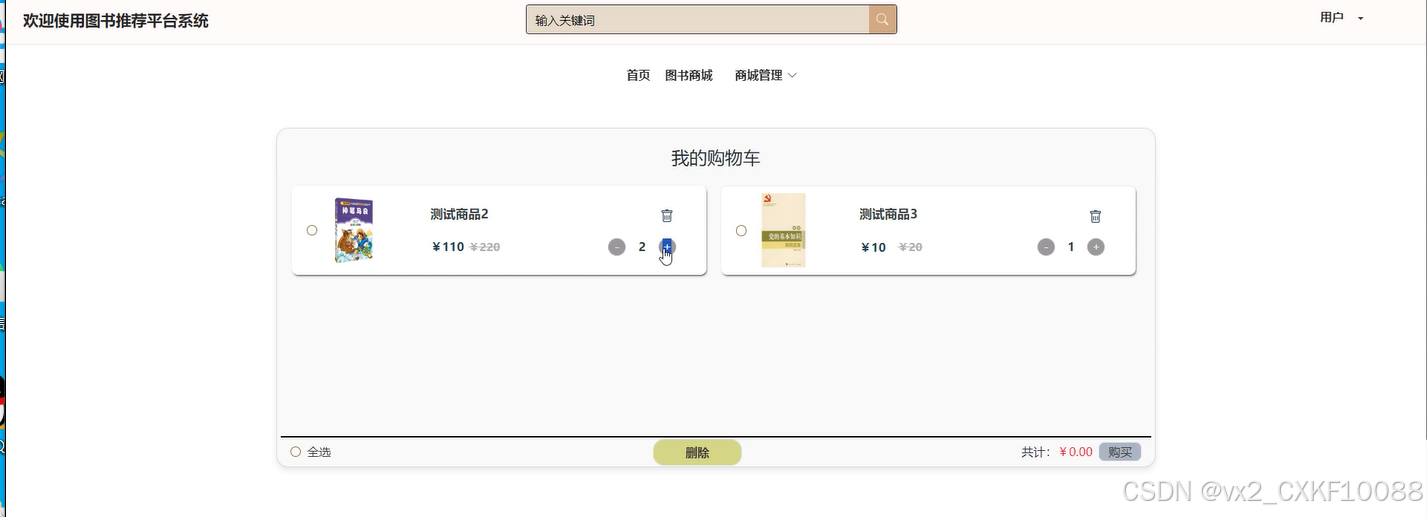 (3)购物车:用户对喜欢的图书可以加购,在购物车里面,可以查看到所有加购的图书,支持对图书数量的更改、删除图书,可以进行选择购买。