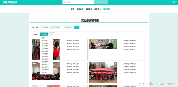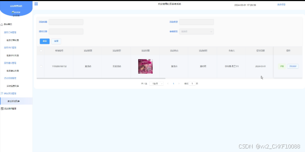 - 参加活动管理:可查看社区用户提交的参加活动信息,进行增删改查操作,支持活动标题、活动类型、提交日期、审核状态搜索,点击可查看详情和进行审核,