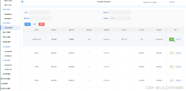 - 服务订单管理:可查看所有服务订单消息,进行增删改查操作,支持订单号、服务名称、服务类型、支付状态搜索,可点击查看详情,和点击进行客户评价(客户评分、评价内容)、支付(微信、支付宝、网银)操作。