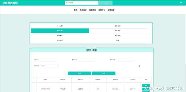 - 个人中心:可对个人首页、服务申请、服务订单、服务评价、服务建议、参加活动、活动测评、收藏等信息进行管控。点击“服务订单”,可查看服务订单消息,进行增改删查操作,支持订单号、服务名称、服务类型、支付状态搜索,可点击查看详情;包括以下功能,点击“服务订单”,可查看服务订单消息,进行查询操作,支持订单号、服务名称、服务类型、支付状态搜索,可点击查看详情,和点击进行客户评价(客户评分、评价内容)、支付(微信、支付宝、网银)操作;点击“服务评价”,可查看服务评价消息,进行增改删查操作,支持订单号、服务名称、服务日期搜索,可点击查看详情;点击“服务建议”,可查看服务建议消息,进行查询操作,支持订单号、服务名称、服务日期搜索,可点击查看详情;点击“参加活动”,可查看提交的参加活动消息,进行查询操作,支持活动标题、活动类型、提交日期、审核状态搜索,可点击查看详情;点击“活动测评”,可查看所有活动测评消息,进行查询操作,支持活动标题、活动类型、测评日期搜索,可点击查看详情;点击“收藏”,可查看所有收藏信息,包括社区资讯和服务中心信息,并进行管理,点击可查看详情新。