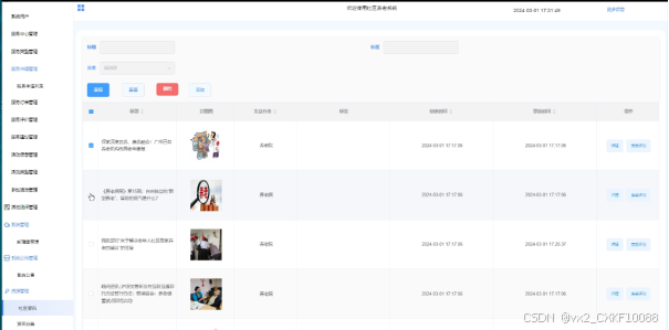 - 系统管理:可对首页的轮播图进行管理,进行增删改查操作,支持标题搜索,可点击查看详情。