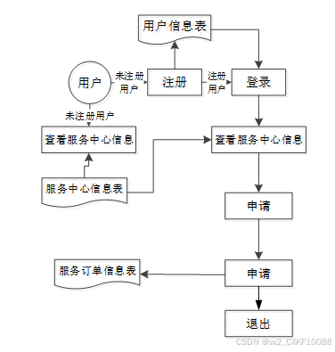 开发社区养老系统最主要的一个目的就是实现用户在服务中心进行对服务信息的的查询和申请,图3-1就是系统的数据流图。
