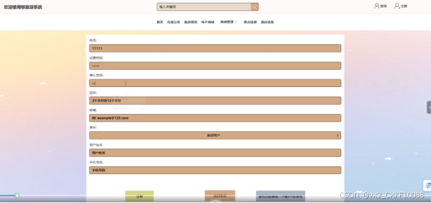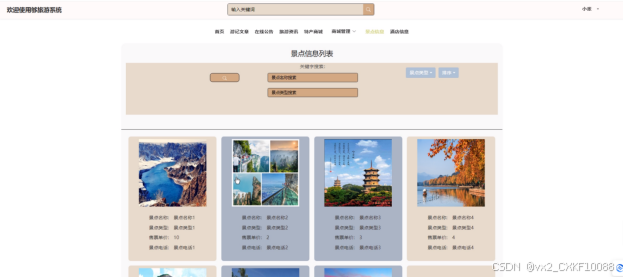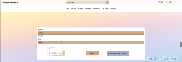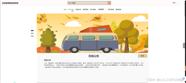 - 首页:用户可以查看系统首页展示的轮播图,在线公告、景点信息推荐等信息。