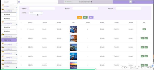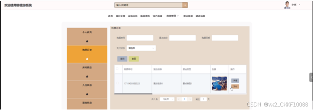 - 购票订单管理:管理员可以查看购票订单列表中个订单的详情,可以对列表信息进行查询、重置和删除操作。