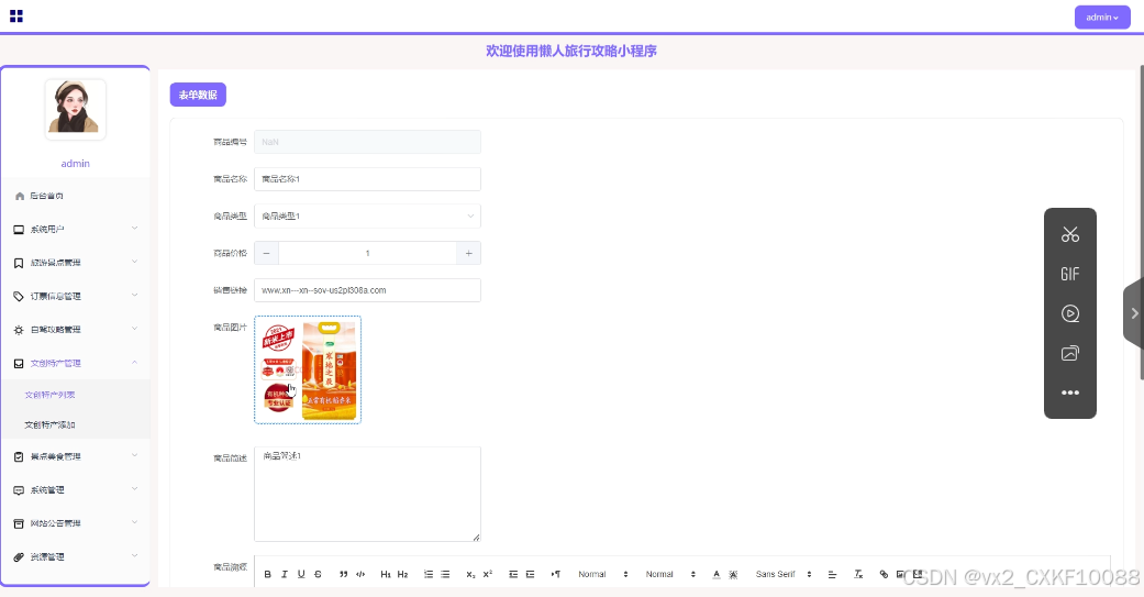 (6)文创特产管理:管理员可以查看文创特产列表,也可以添加文创特产信息。