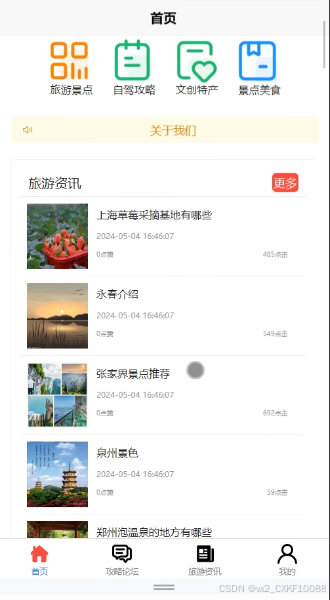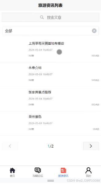 (4)旅游资讯:用户可以查看系统所有旅游资讯,可以查看某一资讯的详情,可以对资讯信息进行点赞、收藏、发表评论操作。