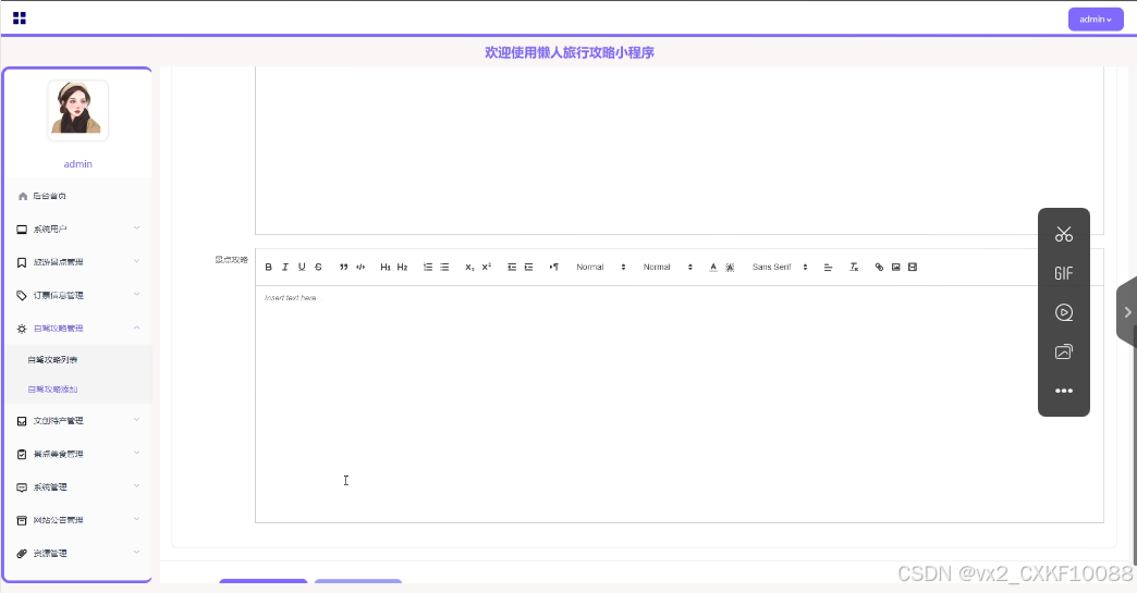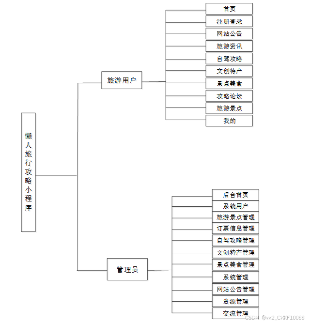 按照懒人旅行攻略小程序的角色,主要包括旅游用户模块和管理员模块这三大部分。