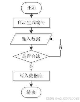 用户成功登入系统后就能够实现增加数据的操作,增加数据的编号是特定的,系统生成,用户不能随意填写,除了编号以外,其他增加信息用户自己填写,填写后的信息经过系统验证,验证合法通过就显示增加数据成功了,相反的话,就没有增加成功,图2-1显示的就是在增加数据时的流程。